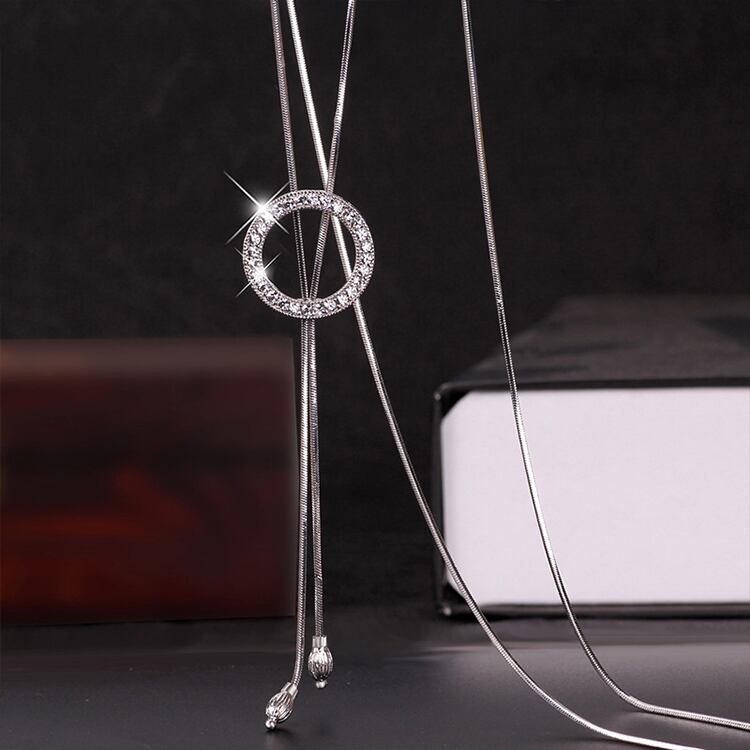 この美しいロングネックレスは、リングモチーフを取り入れたラリエットデザインで、あなたの首元を優雅に彩ります! 繊細に施されたCZダイヤが、キラキラと輝きながら上品な印象を与え、デイリーコーデから特別なシーンまで、幅広く活躍できる一品です。